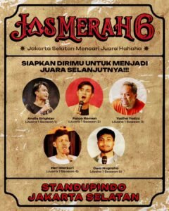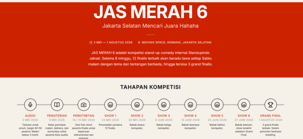 Jakarta, 25 April 2026 – Standupindo Jakarta Selatan dengan bangga mengumumkan pembukaan pendaftaran audisi untuk JAS MERAH 6 — Jakarta Selatan Mencari Juara Hahaha. Kompetisi stand-up comedy internal ini akan berlangsung selama 8 minggu penuh dengan sistem gugur yang ketat.